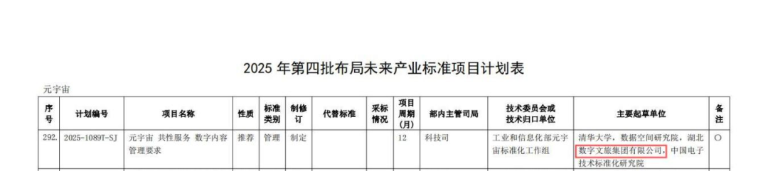 數(shù)旅集團標準建設取得新成果——參編行業(yè)標準入選工信部計劃。近日,數(shù)旅集團參編的《元宇宙共性服務數(shù)字內(nèi)容管理要求》成功入選工業(yè)和信息化部2025年第四批行業(yè)標準制修訂計劃——布局未來產(chǎn)業(yè)標準項目計劃。此次入選,標志著數(shù)旅集團在元宇宙標準化建設方面取得新進展,也為推動構(gòu)建可信、有序的元宇宙生態(tài)提供重要參考。未來,數(shù)旅集團將持續(xù)深化國有企業(yè)改革,充分發(fā)揮“科改企業(yè)”創(chuàng)新主體作用,通過“標準引領、創(chuàng)新驅(qū)動”的發(fā)展路徑,不斷完善標準化工作體系,為文旅產(chǎn)業(yè)高質(zhì)量發(fā)展提供堅實支撐。