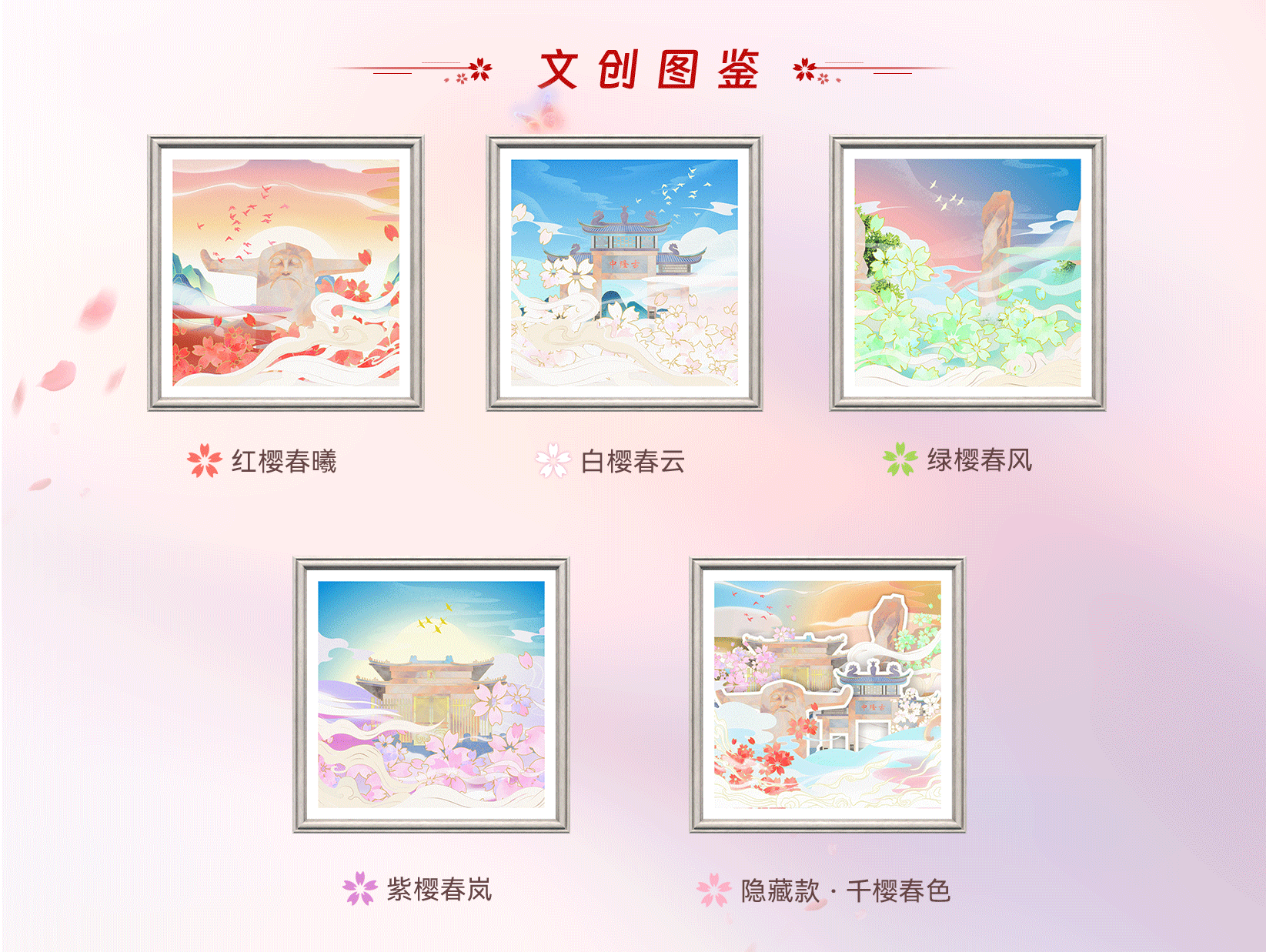 盲盒包含《紅櫻春曦》、《白櫻春云》、《綠櫻春風(fēng)》、《紫櫻春嵐》四款數(shù)字文創(chuàng),總計(jì)400000份。購齊此四款者有機(jī)會(huì)領(lǐng)取隱藏款《千櫻春色》(限量6000份),隱藏款特定編號(hào)的用戶可獲得景區(qū)門票權(quán)益大禮包。