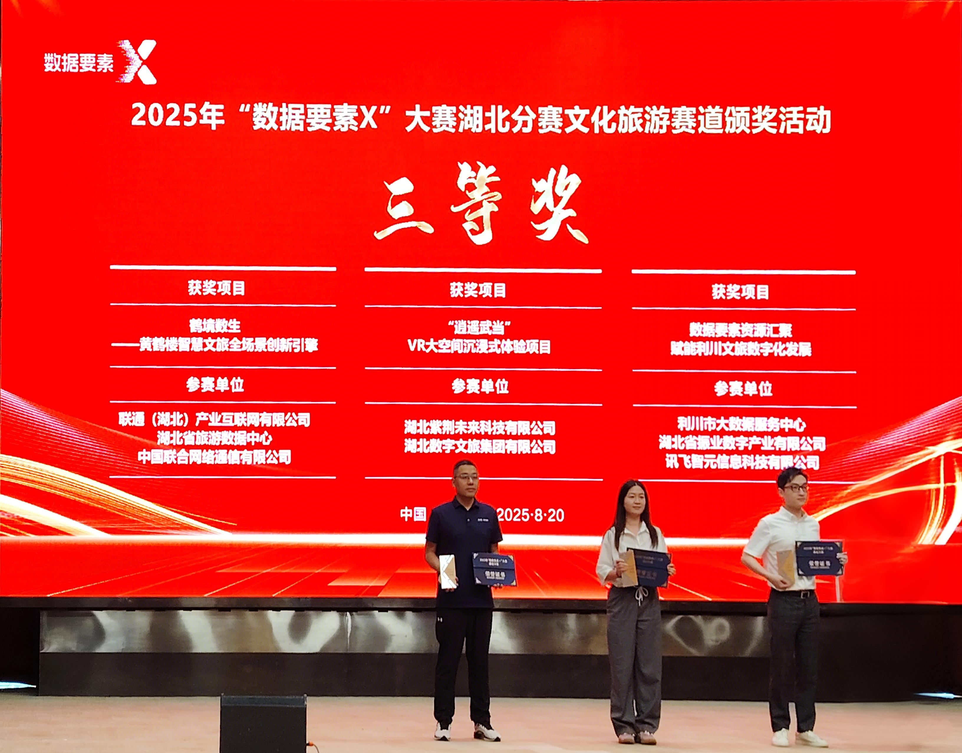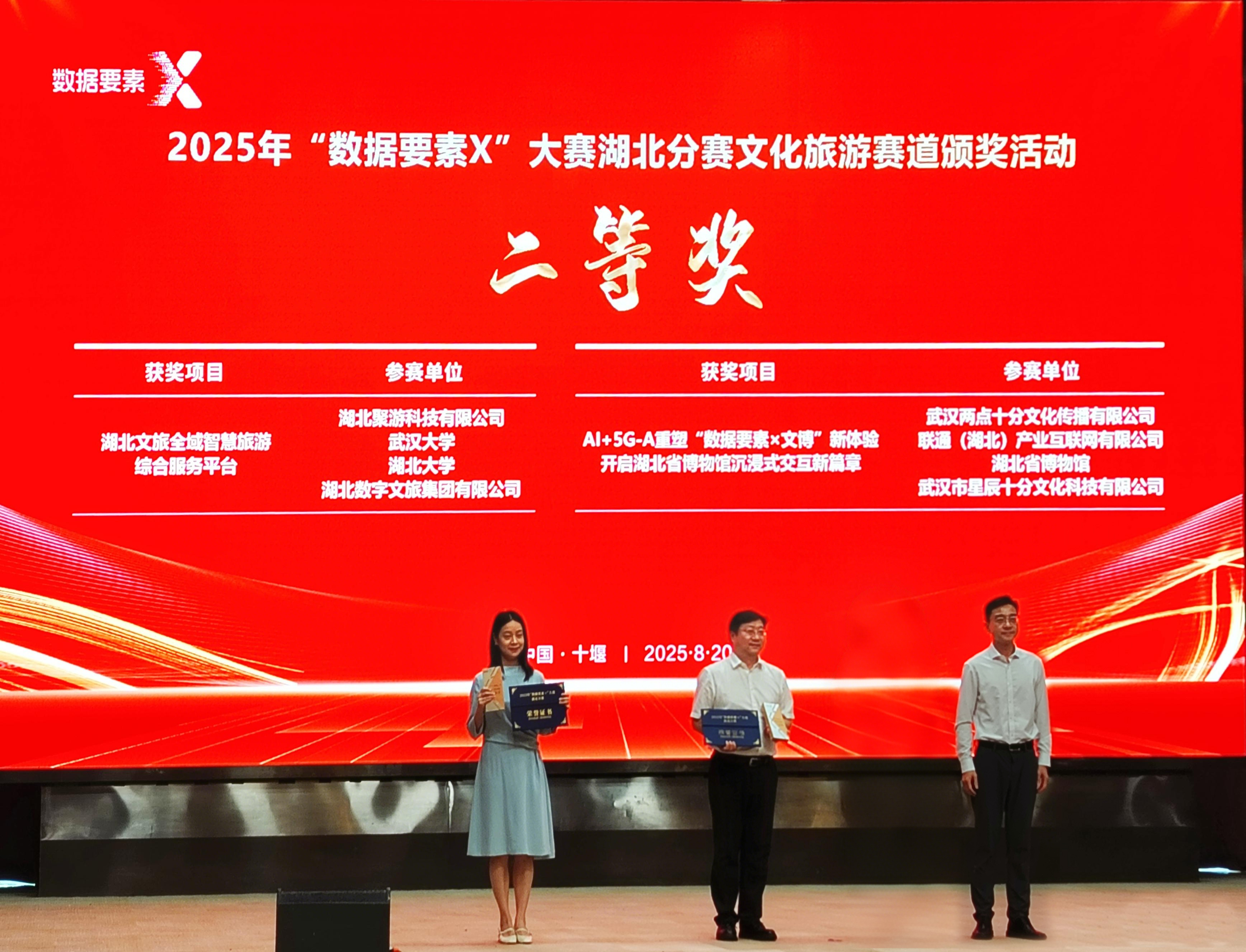 8月20日,由湖北省數(shù)據(jù)局、湖北省文化和旅游廳、十堰市人民政府主辦的2025年“數(shù)據(jù)要素×”大賽湖北分賽文化旅游賽道決賽活動在十堰成功舉行。數(shù)旅集團參賽項目均獲得獎項,湖北文旅全域智慧旅游綜合服務平臺獲二等獎(賽道第2名)、“逍遙武當”VR大空間沉浸式體驗項目獲三等獎(賽道第4名)、無人機航拍服務平臺和智景游景區(qū)綜合運營管理平臺獲優(yōu)秀獎。在參賽數(shù)量、入圍率及獎項層級上均實現(xiàn)顯著突破,充分彰顯了公司在數(shù)據(jù)要素領域的技術積累與創(chuàng)新實力。