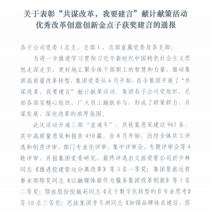 數(shù)旅集團(tuán)獲“共謀改革、我要建言”優(yōu)秀獎