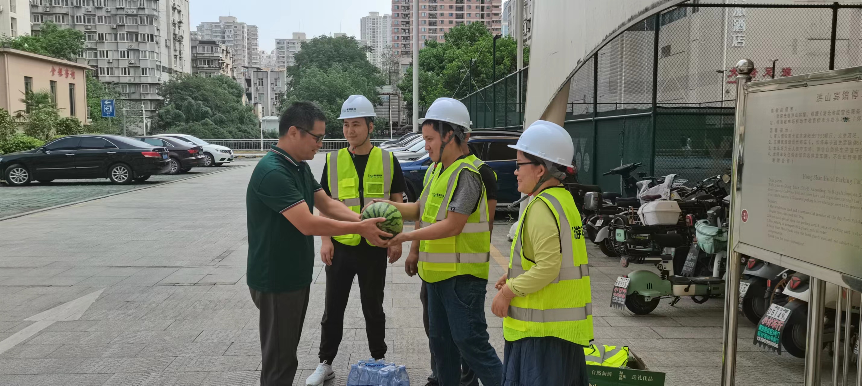 8月9日,數(shù)旅集團(tuán)工會(huì)“關(guān)愛職工 夏送清涼”活動(dòng)走進(jìn)洪山賓館項(xiàng)目施工現(xiàn)場(chǎng),為項(xiàng)目工地一線員工送去工會(huì)的關(guān)懷,現(xiàn)場(chǎng)發(fā)放西瓜、涼茶等防暑降溫物品。慰問組肯定全體參建人員不怕吃苦、迎難而上、艱苦奮斗的精神,同時(shí)勉勵(lì)大家要把握良好發(fā)展機(jī)遇,筑牢安全發(fā)展底線,確保項(xiàng)目如期完成。