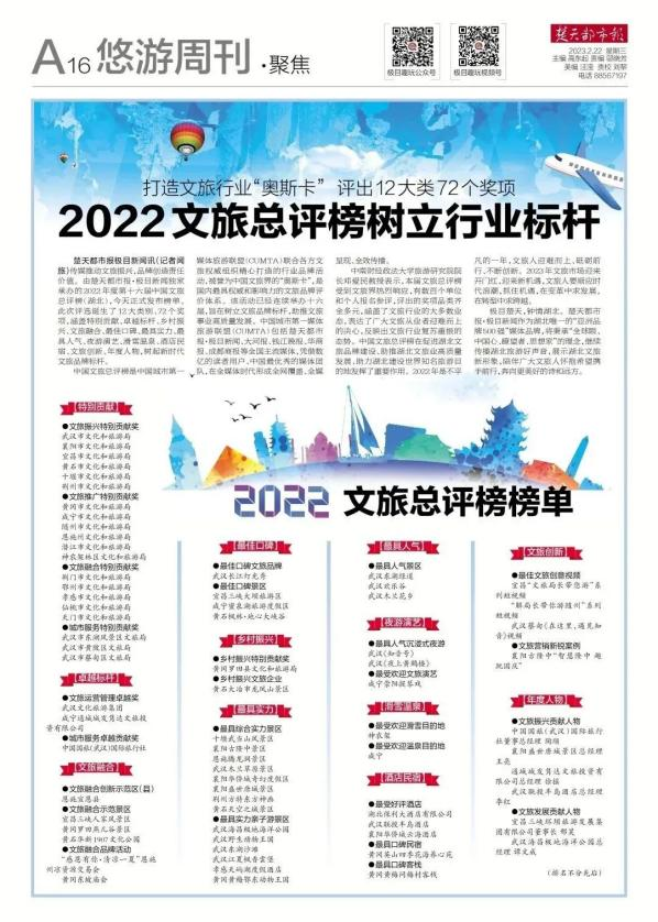 本周熱點(diǎn) 文旅界的“奧斯卡”!古隆中景區(qū)榮獲2022年度中國文旅總評(píng)榜“最具綜合實(shí)力景區(qū)”等獎(jiǎng)項(xiàng)。2月22日,第十六屆中國文旅總評(píng)榜正式發(fā)布榜單,古隆中景區(qū)榮獲中國文旅總評(píng)榜“2022年度最具綜合實(shí)力景區(qū)”、“2022年度文旅營銷新銳案例”。中國文旅總評(píng)榜是在中國文旅品牌(博鰲)論壇背景下,由中國城市第一媒體文旅聯(lián)盟(CUMTA)聯(lián)合各方文旅權(quán)威組織精心打造的行業(yè)品牌活動(dòng),被譽(yù)為中國文旅界的“奧斯卡”獎(jiǎng),是國內(nèi)最具權(quán)威和影響力的文旅品牌評(píng)價(jià)體系?;顒?dòng)自2022年11月啟動(dòng)以來,共收到數(shù)百個(gè)單位和個(gè)人的報(bào)名資料,經(jīng)評(píng)審委員會(huì)專家審定,最終誕生了12大類別、72個(gè)獎(jiǎng)項(xiàng),涵蓋文旅局、景區(qū)、旅游目的地、旅行社、酒店民宿、鄉(xiāng)村振興、演藝夜游、文旅推廣、年度人物等。襄陽古隆中景區(qū)開創(chuàng)了新的文旅融合發(fā)展格局,利用新媒體矩陣,持續(xù)舉辦了多場(chǎng)新媒體活動(dòng),在全國范圍展示了深厚的三國文化底蘊(yùn),展示了湖北文旅新形象。 清江畫廊公司榮獲2022年度中國景區(qū)影響力品牌“年度創(chuàng)新山水型景區(qū)”稱號(hào)。 近日,2022年中國文旅產(chǎn)業(yè)投資運(yùn)營大會(huì)在湖北武漢召開,大會(huì)上公布了2022年度中國景區(qū)影響力品牌榜單,清江畫廊景區(qū)榮獲“年度創(chuàng)新山水型景區(qū)”稱號(hào)。2022年度中國景區(qū)影響力品牌排名是通過監(jiān)測(cè)景區(qū)在互聯(lián)網(wǎng)和移動(dòng)互聯(lián)網(wǎng)的搜索、運(yùn)營、媒體、點(diǎn)評(píng)指數(shù),綜合分析計(jì)算得出MBI/MCI指數(shù)排名,來反映一段時(shí)間內(nèi)景區(qū)在全國的品牌影響力,通過海量真實(shí)數(shù)據(jù)制作榜單。清江畫廊景區(qū)的入選,也代表著文旅行業(yè)正在不遺余力的推進(jìn)文化和旅游產(chǎn)業(yè)鏈合作進(jìn)程,推進(jìn)企業(yè)跨越式發(fā)展,努力為市場(chǎng)提交一份滿意的答卷。 海外(中旅)研學(xué)百人團(tuán)首發(fā)啟動(dòng)。以研學(xué)為途徑,博學(xué)而篤志;以自然為媒,躬行求知。2月15日,海外(中旅)集團(tuán)研學(xué)中心帶領(lǐng)330余名學(xué)子們來到了農(nóng)耕年華研學(xué)基地,一場(chǎng)最美的研學(xué)際遇在等待著他們。2023新春首次啟動(dòng)勞動(dòng)教育研學(xué)之旅,共計(jì)330余名小學(xué)學(xué)子們,在海外(中旅)集團(tuán)研學(xué)中心與學(xué)校的共同組織下,將一年級(jí)至六年級(jí)的學(xué)子們劃分為兩個(gè)團(tuán)隊(duì),一至三年級(jí)以國學(xué)與農(nóng)事為主,將中華國學(xué)與農(nóng)事生產(chǎn)文化代代相傳,既豐富了勞動(dòng)體驗(yàn),又積累了國學(xué)底蘊(yùn)。四至六年級(jí)以手工與農(nóng)耕為主,從小養(yǎng)成熱愛勞動(dòng),勤于實(shí)踐,珍惜糧食,懂得感恩的優(yōu)秀品德并受益終生。 最新資訊 ● 甘肅寧夏攜手打造“大西北”文旅IP。寧夏回族自治區(qū)文化和旅游廳與甘肅省文化和旅游廳在甘肅蘭州進(jìn)行座談交流,共商大西北文旅抱團(tuán)發(fā)展、做大做強(qiáng)大西北文旅品牌,合力促進(jìn)文旅消費(fèi)復(fù)蘇等事宜。根據(jù)會(huì)議消息,甘肅省文旅廳將全力支持寧夏文旅廳提出的關(guān)于“共商籌備第二屆大西北文旅高峰會(huì)、市場(chǎng)化發(fā)行西北旅游一卡通、成立西北生態(tài)康養(yǎng)旅游聯(lián)盟、做大做強(qiáng)大西北文旅品牌”等合作事宜和相關(guān)業(yè)務(wù)工作;寧夏文旅系統(tǒng)將著力加強(qiáng)戰(zhàn)略協(xié)作,精誠推進(jìn)全面融合,共同打造好“大西北”這個(gè)獨(dú)特而共有的超級(jí)文旅大IP,深度推進(jìn)與兄弟省區(qū)的合作,共同提振旅游經(jīng)濟(jì),大力促進(jìn)文旅復(fù)蘇發(fā)展,合力推動(dòng)雙方文旅系統(tǒng)在更大范圍、更寬領(lǐng)域、更深層次開創(chuàng)務(wù)實(shí)合作新局面。 ● 成都高質(zhì)量打造文旅經(jīng)濟(jì)發(fā)展核心區(qū)推動(dòng)世界文化名城建設(shè)。2月22日,成都市文化廣電旅游局發(fā)布《高質(zhì)量打造全省文旅經(jīng)濟(jì)發(fā)展核心區(qū)推動(dòng)世界文化名城建設(shè)行動(dòng)方案》。到2025年,力爭(zhēng)實(shí)現(xiàn)成都市文創(chuàng)產(chǎn)業(yè)增加值3100億—3400億元,占GDP比重達(dá)到12%以上,旅游接待游客達(dá)到3.5億人次,總收入達(dá)到6300億元,文化產(chǎn)業(yè)增加值占全省比重達(dá)到53%,旅游總收入占全省比重增長(zhǎng)到39%。實(shí)施文創(chuàng)、旅游企業(yè)梯度培育計(jì)劃,支持本土龍頭企業(yè)上市及沖刺全國文化企業(yè)30強(qiáng)、中國旅游集團(tuán)20強(qiáng),實(shí)現(xiàn)省級(jí)文化和旅游產(chǎn)業(yè)優(yōu)秀龍頭企業(yè)達(dá)到15家以上。 ● 長(zhǎng)沙打造文旅業(yè)“復(fù)原力” 發(fā)放400萬元消費(fèi)券。長(zhǎng)沙市文化旅游廣電局制定出臺(tái)了《關(guān)于促進(jìn)文旅產(chǎn)業(yè)穩(wěn)定發(fā)展的若干措施》,旨在打造文旅業(yè)“復(fù)原力”,全面促進(jìn)文化和旅游市場(chǎng)高質(zhì)量發(fā)展。將舉辦“長(zhǎng)沙