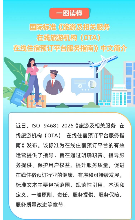 我國(guó)牽頭制定全球首個(gè)在線旅游機(jī)構(gòu)相關(guān)國(guó)際標(biāo)準(zhǔn),以“中國(guó)方案”推動(dòng)全球旅游服務(wù)標(biāo)準(zhǔn)化進(jìn)程。近日,我國(guó)牽頭制定的《旅游及相關(guān)服務(wù)在線旅游機(jī)構(gòu)(OTA)在線住宿預(yù)訂平臺(tái)服務(wù)指南》(ISO9468:2025)國(guó)際標(biāo)準(zhǔn)正式發(fā)布。這是全球首個(gè)在線旅游機(jī)構(gòu)相關(guān)國(guó)際標(biāo)準(zhǔn),旨在規(guī)范全球在線住宿預(yù)訂平臺(tái)及其服務(wù),破解“大數(shù)據(jù)殺熟”“捆綁消費(fèi)”“退改難”等痛點(diǎn),構(gòu)建公平透明的消費(fèi)生態(tài)。《指南》明確了平臺(tái)方和住宿服務(wù)提供商的責(zé)任,規(guī)范了訂購(gòu)、支付、退改、評(píng)價(jià)等環(huán)節(jié)的服務(wù)條款,提出了信息安全、財(cái)務(wù)安全和隱私保護(hù)等方面的服務(wù)保障要求。其發(fā)布是中國(guó)參與全球標(biāo)準(zhǔn)化工作的生動(dòng)實(shí)踐,將推動(dòng)全球旅游服務(wù)在標(biāo)準(zhǔn)化軌道上實(shí)現(xiàn)高質(zhì)量發(fā)展。